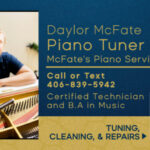 My name is Daylor McFate. I am born and raised in the beautiful state of Montana. I received my B.A. in Music from Montana State University Billings and my certification as a piano technician from the Piano Technician Academy. My wife Katie and I have 3 wonderful daughters. I have a deep passion for music and enjoy singing and playing many instruments, including the piano. I hope to share and bring the joy of music to your home with a well tuned piano.